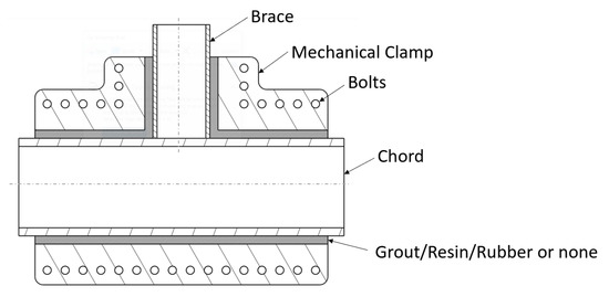 On the other hand, an unstressed grouted clamp consists of a clamp around a tubular joint filled with some grout material. The bond between the grout and joint is responsible for load transfer. Less detailed sizing is required for unstressed clamps than for stressed clamps. A grouted clamp could be installed rapidly and relatively easily, allowing for substantial fit-up tolerances [17,18].