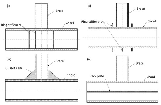 On the contrary, external ring stiffening can be easily applied to erected structures. It can significantly enhance the axial and out-of-plane load capacity of a joint. A parametric study of an X-joint reinforced with external ring stiffeners showed strength enhancement up to twice the original joint strength [30]. A typical T-joint strengthened with three external ring stiffeners is shown in Figure 9ii. Gussets/ribs are used for enhancement in in-plane load capacity. Various configurations of ribs can be applied to tubular joints based on the geometry and load requirement. A typical T-joint reinforced with triangular ribs is shown in Figure 9iii. Rack plates were investigated for enhancement in in-plane load capacity. Continuous or segregated rack plates can shift and reduce hotspot stress. Woghiren and Brennan [31] analyzed the muti-planar tubular KK joints reinforced by rack plate stiffeners and found a reduction in SCF and enhancement in fatigue life. The hotspot stress region can be transferred by incorporating a rack plate stiffener to a location with easy access for nondestructive testing (NDT). Parametric equations were derived using regression analysis to calculate the SCF and the probable location of fatigue crack initiation. A typical rack plate installed at the chord center of a T-joint is shown in Figure 9iv. The studies highlighted here show the effectiveness of stiffener welding for various joint types.