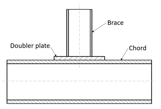 A doubler plate is a plate welded to the chord using fillet welding to increase its thickness locally. The brace is then welded to the plate using fillet welding, as shown in Figure 10. A doubler plate can strengthen a joint that needs reinforcement or additional load capacity to resist punching shear stress. Fung et al. [32,33] studied the maximum capacity of a doubler plate-reinforced T-joint and found that the doubler-plated configuration resisted axial compression and tension, in IPB and OPB efficiently. The length of the doubler plate and brace angle were found to have little effect on the final capacity, with the brace-to-chord thickness ratio significantly affecting load capacity enhancement. Hoon et al. [34] tested a doubler-plate-reinforced tubular T-joint under combined loads. They found that hotspot stress shifted from the chord–brace interface to the brace–doubler plate interface, and SCF was reduced due to doubler plate incorporation at a tubular joint.