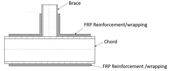 Fiber-reinforced polymers (FRP) composite reinforcement has been successfully used over the past three decades in bridges, beams, and columns, with significant reinforcing capacity. Researchers have gradually introduced FRP composites to offshore structures in recent years. Recent versions of widely acceptable codes and standards, such as ASME PCC-2 [43] and ISO 24,817 [44], consider composite reinforcement a legitimate repair method for offshore structures. FRP repair has more benefits than the welding method [45]. FRP composite repair provides safety, ease of application, applicability without hot work, and high ultimate strength. A single FRP material can be designed for vast specific strength/stiffness requirements and can be applied to complex shapes/profiles, even with limited accessibility [13]. Numerous researchers have investigated the rehabilitation of tubular joints using FRPs, yet these studies are limited to elementary joint types and load cases. A conceptual scheme of FRP reinforcement for a typical T-joint is illustrated in Figure 12.