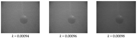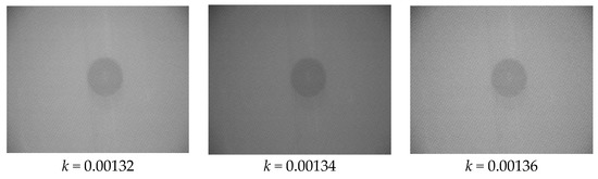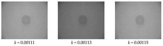 The theoretical value of the parameter k under the artificial lighting conditions can be obtained by the power spectrum, i.e., k = 0.00113. Then, according to the flowchart in Figure 5, different k values are used to restore images by the step size of 0.00001 near the theoretical value. The k values corresponding to the maximum definition on the both sides of 0.00113 are recorded. The restored images under the recorded values and the theoretical value of the parameter k are shown in Figure 9, and the corresponding definition is shown in Table 4.