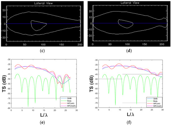 In large fish, most backscattered energy is derived from the SWB. The change in TS is caused by the shape of the SWB. Incoherent TS predictions of large fish show significantly different results from those estimated using the coherent model. At small (<0.15) ka values, scattering from the SWB at rather high frequencies is a function of and (cf. Equation (5)), which are both dependent on ka. , where is the ratio of SWB radius to the total fish length, which is essentially constant for any fish. When ka > 0.15, backscatter estimated from the swim-bladder is calculated using the Kirchhoff integral, Equation (5), and results in a more complicated frequency response. To illustrate this, we calculated the TS frequency responses with an example involving two fish (designated Fish A and B) with similar lengths (~200 mm) and SWB position (Figure 4a–d). The frequency-dependent TS values calculated from the two models are shown in Figure 4e,f. TS values of the whole fish using the coherent KRM model have larger backscatter amplitude fluctuations overall and along the curves compared to backscatter predictions from the incoherent model. For orthogonal incidence (e.g., downward-looking echosounder), the frequency response from swim bladders primarily depends on the area and rugosity of the swim-bladder dorsal surface. The dorsal surface area of Fish A’s swim-bladder is larger compared to that of fish B. In this case, backscatter from the two fish bodies is predicted to have essentially the same overall TS (max ~−45dB) and frequency-dependent backscatter patterns. Differences in TS frequency responses are attributed to differences in the relative backscatter contributions from the swim-bladder and the fish body in each fish. For Fish A, the difference between the maximum and minimum TS using the coherent KRM model is 24 dB (Figure 4e), and only 17 dB predicted by the incoherent KRM model (see Table 3). The incoherent backscatter TS curve is much smoother than the coherent predicted backscatter curve. A smoother pattern is observed for Fish B (Figure 4f).