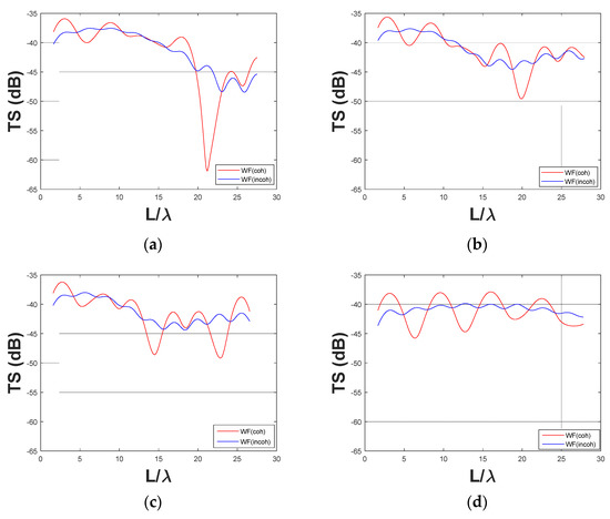 Incoherent TS predictions of small fish are significantly different from results estimated using the coherent model. Backscattered waves from fish SWB and body interact to strengthen (i.e., constructive) or weaken (i.e., destructive) the resulting wavefront (i.e., interference). As a result, this cross term may be positive or negative, depending on the morphologies of the SWB and FB, as well as their relative locations and orientations. Constructive interference results in a larger . Destructive interference reduces to values less than those from the swim bladder ().