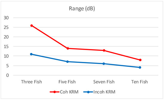 TS curves calculated with the incoherent KRM model always resulted in smoother frequency response curves and smaller amplitude fluctuations, indicating that the incoherent TS predictions are less variable and statistically more robust across the frequency range. As shown in Figure 5, both the amplitude range and the standard deviation decreased as the number of fish in each group increased, whereas mean and median TS values over the entire frequency range remain fairly constant (Table 4). According to the central limit theorem [46], when the sample size increases, the range and standard deviation should decrease (Figure 6 and Figure 7).