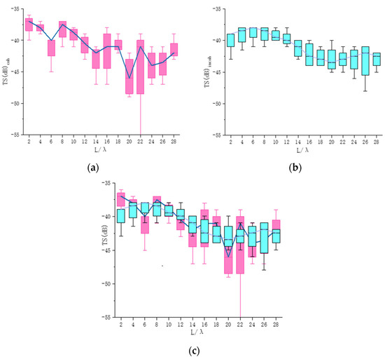 Box and whisker plots of (a) coherent and (b) incoherent Kirchhoff-ray-mode (KRM) predicted target strengths (TS) from ten fish of 200 mm length. (c) Comparison of the two plots. Median values plotted across the fish length to acoustic wavelength ratio (L/λ) match predictions from the incoherent KRM model.