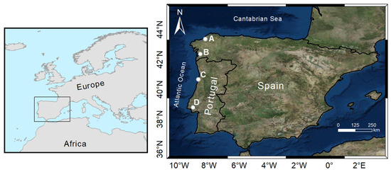 NW Iberian Peninsula. White circles are the locations of the ports considered for this study. (A) A Coruña Outer Port (43.35° N, 8.51° W), (B) Vigo (42.23° N, 8.74° W), (C) Aveiro (40.64° N, 8.75° W), and (D) Lisbon (38.70° N, 9.17° W).