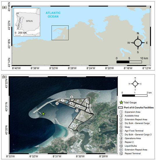 Study area and location of the A Coruña Outer Port (a) and the business areas (b).
