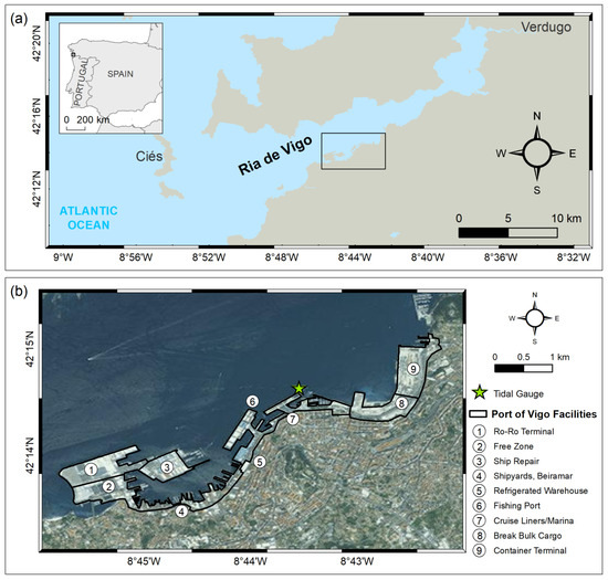 The Ria de Vigo (Figure 3a) supports important touristic and industrial activities [59], being a major shipyard centre and constituting Europe’s principal landing point for fishing [60]. The Vigo port jurisdiction area (Figure 3b) comprises the whole Ria de Vigo region, limited in the south by the Punta Lameda, in the north by Cape Home, and in the west by the Cíes Islands [61]. These features allow the port to operate 365 days a year. Most of the infrastructures in Vigo port are for freight, passenger and fishing vessels, being located on the southern margin of the Ria de Vigo. For detailed port information, the reader is referred to the port administration website (apvigo.es).