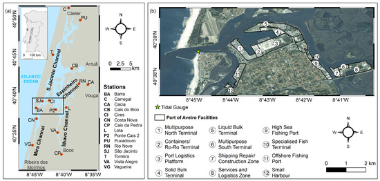Location of the Aveiro port (a) and the business areas in the port administration jurisdiction (b) [34].
