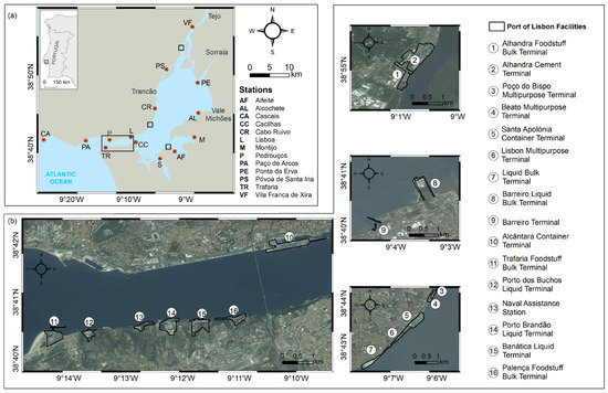 Lisbon port’s location (Figure 5a) and structure were established during the first decades of the 20th century, boosted by the local industry and maritime traffic. Since then, the expansion of the port towards the inner regions of the estuary has taken place, with the settlement of new terminals. The port activities (Figure 5b) range from handling of containerised cargo, roll-on/roll-off, break-bulk cargo (located on the north bank of the port) and liquid and solid bulk cargo (south bank of the port). For detailed port information, the reader is referred to the port administration website (portodelisboa.pt).