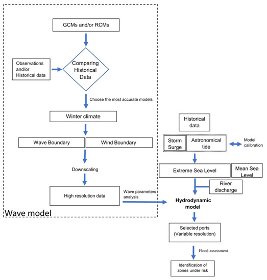However, the CMIP6 GCMs have a coarse resolution, whereas CMIP5 GCMs have been used and applied to several regions by using a downscale of the GCMs and obtaining higher resolution regional climate models (RCMs). These RCMs can be found in other online databases where future wind and wave fields are available (Copernicus, the World Meteorological Organization’s Catalogue for Climate Data, the Commonwealth Scientific and Industrial Research Organisation (CSIRO), among others). These fields can be used in third-generation spectral wind–wave models (e.g., Delft3D though the wave module [132], WAVEWATCH III [133], SWAN [134], among others) in order to downscale the global results at refined resolutions. The results from wave models can be used to determine the currents in the hydrodynamic model by using an offline or a two-way wave–current interaction, which is limited to the features of the hydrodynamic model and the type of data. A summary of the procedure followed in this study to assess the flood risk under the future winter climate is shown in Figure 6.