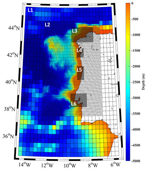 The larger domain (L1) extends from 34.54° N and 14.54° W to 45.54° N and 5.54° W, followed by the second domain (L2) from 37.54° N and 12.54° W to 44.54° N and 6.88° W, and the third set of domains (Punta Langosteira (L3), Vigo (L4), Aveiro (L5) and Tagus (L6)) which correspond to the local ports domains. The resolution applied to each domain was the ratio of 1/3 from the previous domain, creating a resolution of 1/3°, 1/9° and 1/27° for domains L1, L2 and L3-L6, respectively. The numerical bathymetry was built based on the General Bathymetric Chart of the Oceans (GEBCO) (www.gebco.net (accessed on 1 November 2022)), the European Marine Observation and Data Network (EMODnet) (emodnet.ec.europa.eu/en/bathymetry (accessed on 1 November 2022)) and the International Hydrographic Organization Data Centre for Digital Bathymetry (IHO DCDB) (www.ncei.noaa.gov/maps/iho_dcdb (accessed on 1 November 2022)) database. Regarding the coastal and port regions, the use of high-resolution bathymetry is required, which was obtained from the port’s administration.