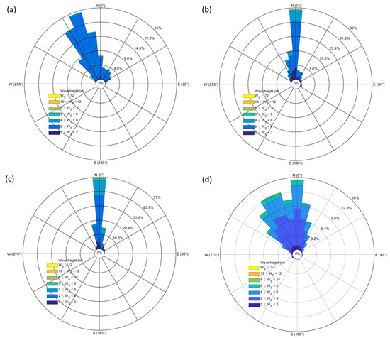 The Azores anticyclone influences the weather and climate observed in the Rias Baixas region, where the winds are predominant from NNE in the winter and from northeast to the northwest in the summer [56,57]. This seasonal pattern is also observed in the wave regime, with great inter-annual variability, where the swell component is predominant most of the year [47]. In the winter, the significant wave height usually ranges between 1–3 m, reaching up to 10 m during storms, and presenting a northwest dominant wave direction [58].