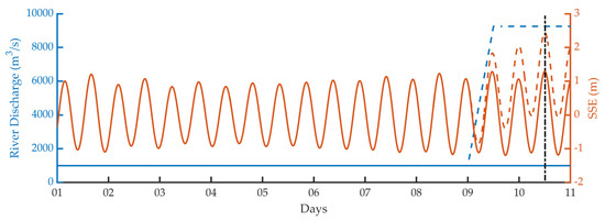 These scenarios were imposed at the open ocean boundary of each model with the time series of the ESL, with nine days as the initial spin-up, and with a tide considering the reference value [34]. After, the following two days considered the storm surge, tide and extreme river discharge, with the matching between their peaks representing the ESL for each climate period and return period (Figure 9).