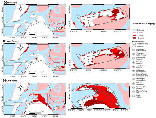 Flood extent mapping of the Aveiro port’s terminals (numbers 1–12) located along the lagoon margins. Reference scenario under present climate and 10-, 25- and 100-year return periods are determined for the (a) historical (1979–2005), (b) near future (2026–2045) and (c) far future (2081–2100) climate periods. The data was retrieved from [34].