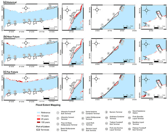 Flood extent mapping of Lisbon port’s terminals (numbers 1–16) located along the estuary margins. Reference scenario under the present climate and 10-, 25- and 100-year return periods are determined for the (a) historical (1979–2005), (b) near future (2026–2045) and (c) far future (2081–2100) climate periods.