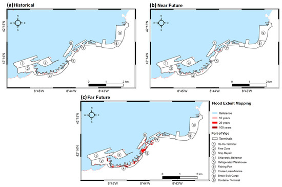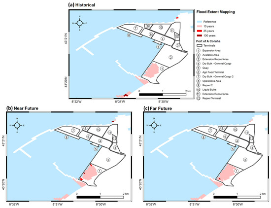 The Vigo port has high resilience to the climate drivers in the historical period, as only some marginal areas of the port terminals are inundated (Figure 12a). The ports resilience is also observed for the near future climate drivers (Figure 12b), where the flood extent impact slightly increases compared to the historical period. These floods occur at the margins of the terminals, where the slipways are located, which will not restrain the activities. The flooded area is considerably expanded for the far future climate drivers (Figure 12c), representing some challenges regarding long-term climate change readiness for the uses and activities management and operability that lies at the estuary margins. During this period, the flooding of some port areas is quite significant, compromising the port activities in these sectors, particularly the central section of the port (4, 5 and 6). These flood patterns suggest that the climatic drivers considered are quite relevant for determining future flooding at this port, which could result in damage and interruptions to terminals in the distant future [19,153].