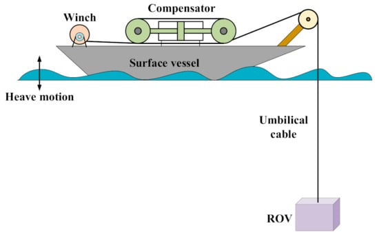 However, the marine environment is complex and volatile. The ship is subject to significant free motion in extreme sea conditions, which includes mainly heaving, flat rocking, transverse rocking, and longitudinal rocking motion, which will lead to dramatic changes in the heaving motion amplitude and umbilical cable tension of the underwater robot, seriously affecting the safety and efficiency of marine operations []. To address the previous questions, heave compensation systems have been researched and developed in the past few decades and are widely used in marine operation equipment such as for deep-sea exploration, deep-sea salvage, and deep-sea oil and gas extraction []. Furthermore, they can eliminate the lifting and sinking motion of the surface vessel relative to the underwater robot, thus avoiding the impact load caused by the cable’s slack and effectively preventing the damage and breakage of the cable []. The active heave compensation system consists of sensors that detect the current motion state of the vessel and the underwater robot and transmit it to the controller, which then actively compensates for it via a flexible umbilical cable. The hydraulic unit supplies power to the controller, as shown in Figure 1, which regulates the vertical umbilical cable length utilizing a hydraulic cylinder. Since the system is a distributed parameter system, and the robot heave compensation is performed by a single control input at the hydraulic cylinder, more complex nonlinear dynamic characteristics must be considered in the feedback control design [].