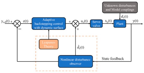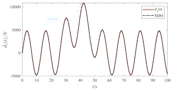 where , is the design parameter, and . indicates robust control parameters and is used to correct for the prediction error of unknown disturbances . The third and fourth terms in Equation (18) are applied to demonstrate the robustness of the nonlinear disturbance observer and the adaptive law for the upper bound of the design disturbance error , respectively.
