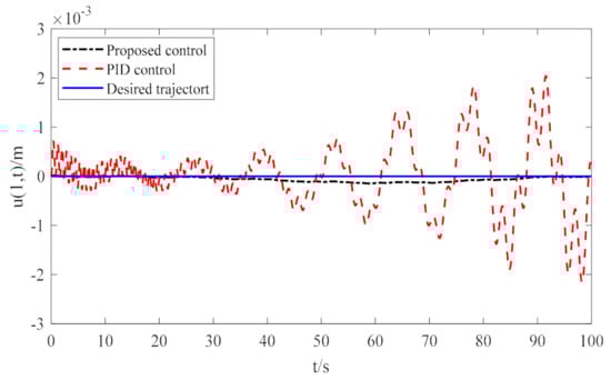 To verify the effectiveness of the controller proposed in the previous section, the key technical parameters of the deep-ocean robotic compensation system are selected as follows: kg, N, kg/m, and Ns/m2. The initial length of the umbilical cable is 10 m, and the final length is 1000 m. The umbilical cable and the robot are initially static: m and m/s. The key physical parameters of the system are selected as kg, kg/m3, m2, , , , m3/(s·pa), , Mpa, and pa.