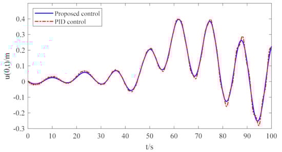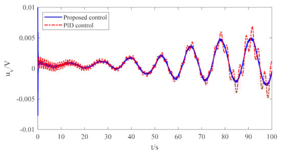 The active compensation results of the deep-ocean robot under the proposed nonlinear disturbance observer-based and robust adaptive output feedback controls are displayed in Figure 8. From the graph, it is noticeable that the effect of PID control gradually becomes worse with the increased length of the umbilical cable, whereas the control scheme suggested above can effectively suppress vibration. The vibration amplitude gradually converges to zero as time increases. Additionally, the maximum compensation error of the PID controller is about 2.2 mm, whereas the maximum compensation error of the controller proposed in this paper is about 0.1 mm. From Figure 6 and Figure 7, the nonlinear disturbance observer enables the online estimation of disturbances and achieves satisfactory estimation performance. Figure 9 and Figure 10 show the piston rod displacement and control input voltage of the servo valve, respectively. From this, the maximum piston displacement under PID control is approximately 33 mm more than the control scheme proposed in this paper, and the PID control input voltage may exceed the maximum input voltage over time and oscillate, with harmful effects on the vibration rejection of the robot. Therefore, the robust controller proposed above has a superior performance over conventional PID control in terms of the effectiveness and robustness of the active heave compensation of the robot.
