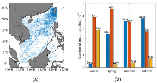 The WOD13 data in this paper is selected for the regions 105° E–122° E and 3° N–26° N, and the time range is from 1 January 1966 to 1 January 2013. The spatial distribution of the stations is shown in Figure 1a, which spreads over the whole SCS. After quality control processes, 29,317 profiles remained. The number of profiles for each season is shown in Figure 1b. There were 7105 profiles in the winter, 7378 profiles in the spring, 7445 profiles in the summer, and 7389 profiles in the autumn, with relatively uniform distribution across the seasons.