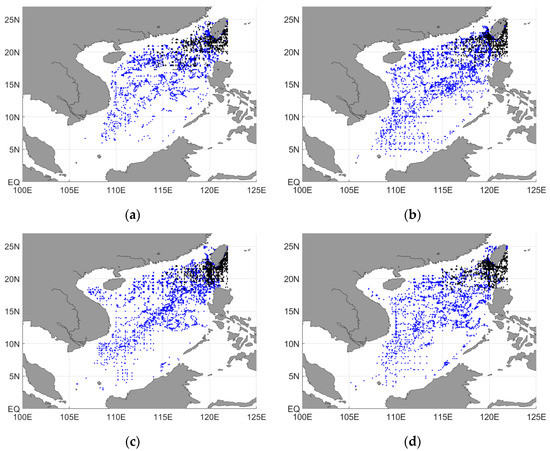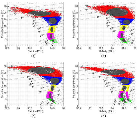 Subsurface water mass division. (a) Winter, (b) spring, (c) summer, and (d) autumn. Blue scatter: the SCS subsurface water (U); black scatter: the Kuroshio subsurface water (KU).