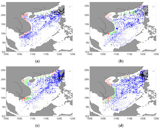 The SCS deep water (D) is mostly found in seas more than 900 m deep. It is the body of water with the greatest thickness, and its salinity and temperature are essentially identical to those of the deep waters in the WPO. It has been confirmed that a large amount of deep Pacific Ocean water enters the SCS via the LS (1.5 Sv) [66]. The low-temperature, high-salinity Pacific Ocean deep water enters the SCS and sinks, which may form a cyclonic deep circulation. In winter, the salinity ranges from 34.35 to 34.62 and the temperature is below 5.0 °C (Figure 2a). In other regions, the salinity ranges from 34.30 to 34.70 and the temperature is below 5.5 °C (Figure 2b–d). This water mass is the most stable in the SCS, and its seasonal and regional variations in temperature and salinity are not obvious.