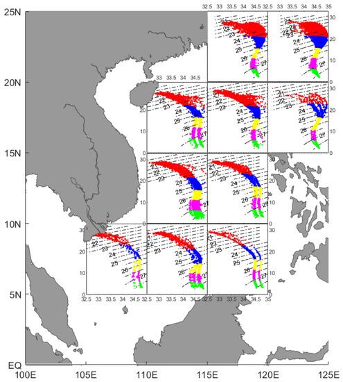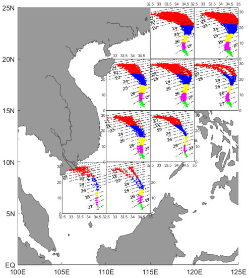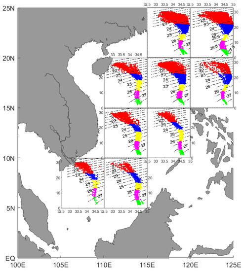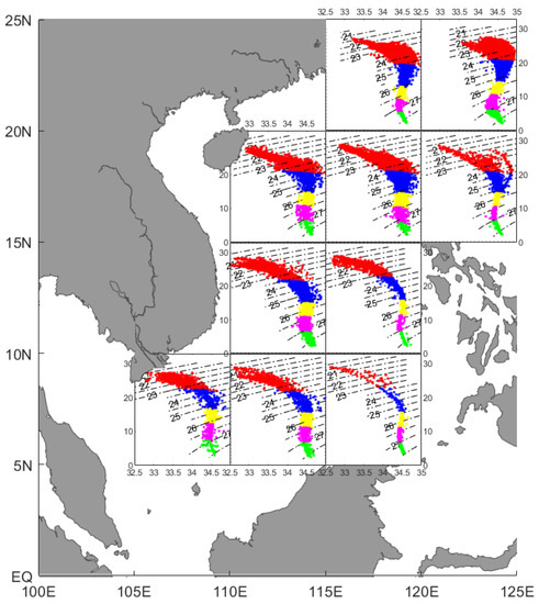 To analyze the intrusion of Kuroshio water into the SCS, the SCS and the LS (5° N–25° N and 105° E–125° E, respectively) were divided into small regions of 5° × 5° following Qu et al., 2000 [35]. Every single region was clustered separately and combined with the T-S diagram to analyze the spatial variation of each layer of water, as well as the seasonal change of entry of the outer waters into the SCS.