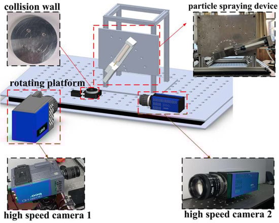 The principles of the experimental device for particle collisions with a rotating wall are shown in Figure 1. The experimental system consists of a particle-spraying device, a rotating wall table, and a high-speed camera acquisition and processing system. The rotating wall table is composed of a rotary table and a collision wall, and the collision wall is a circular metal wall. The rotary table is driven by a stepper motor, which drives the collision wall to rotate synchronously, while an electric signal is used to control the stroke of the stepper motor with precise rotational speed control. The particle-spraying device is connected to a pressure pump through a hose, and the pressure pump provides air pressure for the particle-spraying device to promote the movement of a telescopic rod to eject particles at marker points. The input air pressure is adjusted using a pressure-regulating valve to ensure the incidence velocity of the particles remains unchanged. Two high-speed cameras with frame rates of 1000 and 2000 frames per second are used to capture the front view and side view of the experiment, respectively.