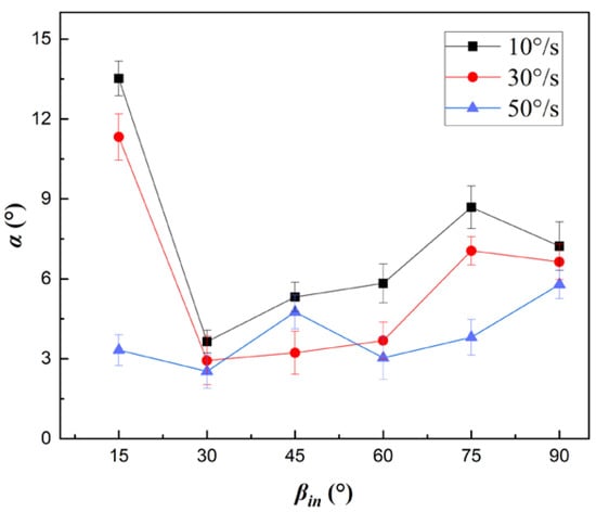Figure 3 describes the influence of different wall revolution speeds on the deflection angle after particle rebound. As shown in Figure 3, particle deflection angle decreases as wall revolution speed increases. This phenomenon may arise because the normal component of the particle incidence velocity is constant at the same incidence angle, making the contact time between the particle and the wall constant. In the case of an increasing revolution speed, frictional displacement between the particle and the wall increases, which causes kinetic energy loss of the particle in the X-axis direction to increase, resulting in a decrease in particle deflection angle. In addition, deflection angle tends to increase gradually with increases in the particle incidence angle in general. This is due to the fact that at a constant wall revolution speed, as incidence angle increases, the normal component of particle incidence velocity gradually increases. This causes the contact time between particle and wall to decrease, velocity energy loss of the particle in the X-axis direction caused by friction to decrease, and deflection angle to increase.