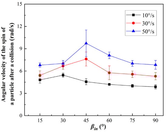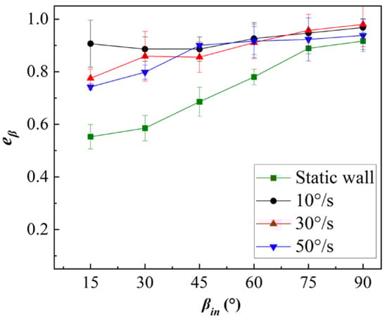 Figure 8a depicts the effect of the rotational speed of the wall on the kinetic energy coefficient of restitution of the particle. As shown in the figure, the kinetic energy coefficient of restitution of the particle gradually decreases as the incidence angle increases, indicating that the relative amount of kinetic energy lost by the particle is greater at a large collision angle under the rotating wall condition. The kinetic energy coefficient of restitution increases with increases in rotation speed, and the kinetic energy coefficient of restitution under the rotating wall condition is greater than that under the static wall condition. This shows that energy is obtained by friction between the particle and the rotating wall during the collision process, and the obtained energy mainly increases the kinetic energy of the spin angle velocity of the particle; the amount of increase grows with increases in the rotational speed of the wall, so the energy coefficient of restitution increases with increases in the rotational speed of the wall.