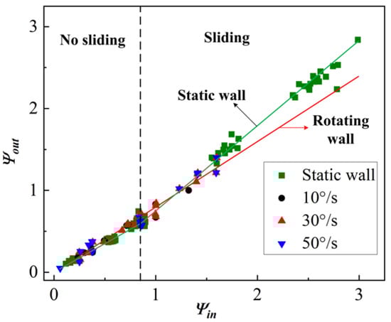 In studies of particle collisions with static dry walls, it is generally accepted that there is a slip–viscosity bifurcation in static dry wall conditions. That is, as the angle of incidence becomes larger, contact between particles and the wall gradually changes from a slip state to a viscous state. To further investigate whether slip–viscosity bifurcation also exists when particles collide with a wall under rotating wall conditions, the tangential elastic compliance theory analysis in Maw [2] is applied to the processing of experimental data in this study. is the characterization function of the collision incidence angle, and is the characterization function of the corresponding rebound angle. These functions are defined as follows:
