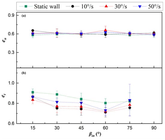 Figure 6 describes the velocity recovery coefficient of particles at different rotational speeds of the wall. As can be seen from Figure 6a, the normal velocity coefficient of restitution of particles under static wall conditions does not change significantly from that under rotating wall conditions. This indicates that the normal velocity coefficient of restitution is only related to the material properties between particle and wall in both the rotating wall condition and the stationary wall condition.