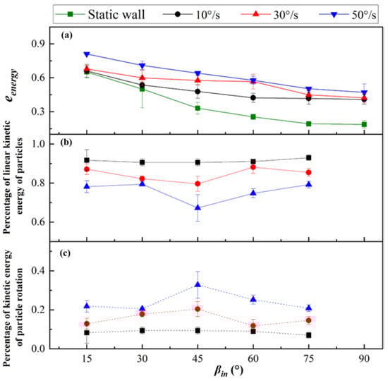 Figure 8b,c describe the proportions of linear velocity kinetic energy and angular velocity kinetic energy of the particle in the total kinetic energy of the rebound. The proportion of the kinetic energy of the linear velocity of the particle is inversely related to the rotational speed of the wall. The proportion of particle rotational kinetic energy is positively correlated with the rotational speed of the wall. This shows that wall rotation provides energy for increases in the particle spin angle, which increases the proportion of particle rotational kinetic energy; this is also the same as the trend of change in the angular velocity shown in Figure 4. The kinetic energy of the particle spin angular velocity increases with increases in the incidence angle, and the rotational speed of the particle first increases and then decreases. For the case of low wall rotational speed, this trend is not obvious and the curve is relatively flat. Under the rotating wall condition, even if particles can obtain rotational kinetic energy from friction work with the wall, the kinetic energy obtained after rebound still cannot make up for the kinetic energy lost during the collision process, and the kinetic energy coefficient of restitution is still less than 1.