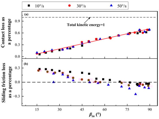 From Figure 9a, it can be seen that contact loss from particle–wall collision increases with increases in the incidence angle. When the incidence angle is greater than 55°, contact loss is the main form of energy loss in the collision process. There is no obvious distinction between the experimental results at different wall rotational speeds and the trend is the same, indicating that contact energy loss of particles against a rotating wall does not change with the rotational speed of the wall; that is, contact energy loss is always only related to the material properties of the particles and the wall, and the normal velocity recovery coefficient is the same. The ratio of contact energy loss to total energy is positively correlated with incidence angle. The data points in the figure show the same linear trend distribution.