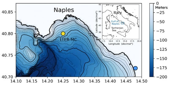 The measurement campaign took place in the Gulf of Naples (GoN)—a coastal bay located in the Mediterranean Sea (Figure 1). The GoN has a sub-tropical climate and low tides, and its bathymetry is generally gentle and regular in the eastern half. It is bordered by several mountain systems (e.g., Mount Vesuvius to the northeast, the Lattari Mountains on the Sorrentine Peninsula to the east and southeast) and the river Sarno flows through the region. In contrast, the western half of the GoN is more rugged and includes several deep submarine canyons (e.g., Canyon Dohrn, Bocca Grande) that extend from the islands of Capri in the south to Ischia in the west. The Marechiara (MC) coastal reference point, located 2 km from the coast at a depth of 75 m, has been used for over 30 years as a monitoring site within the framework of the national long-term ecological research network (LTER-MC).