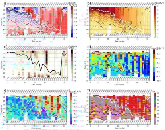 Temporal sequences of the vertical profiles of (a) salinity and density (black contours), (b) temperature and density (black contours), (c) turbidity, (d) dissipation rates of turbulent kinetic energy, (e) diffusion rates of turbulent kinetic energy, and (f) the buoyancy Reynolds number. MC casts are indicated over the cast number. Dates are shown on the upper x-axis. For all plots: main thick line indicates the , red and blue lines indicate the average depth of the 1st and 2nd baroclinic modes, respectively.