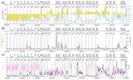 (a) Time series of the wind friction velocity (blue), buoyancy fluxes (plain yellow); (b) net precipitation rates (black) and river discharge (orange). River discharge is considered at the Sarno river’s mouth (see Figure 1). (c) Time series of the significant wave height (black) and Langmuir number (pink). All plots: the time range of the 24 h preceding each cast is indicated with the gray backgrounds; cast’s number (1–31) with the MC number (1160–1190, see Table 1) are indicated on top; cast’s date is indicated below.