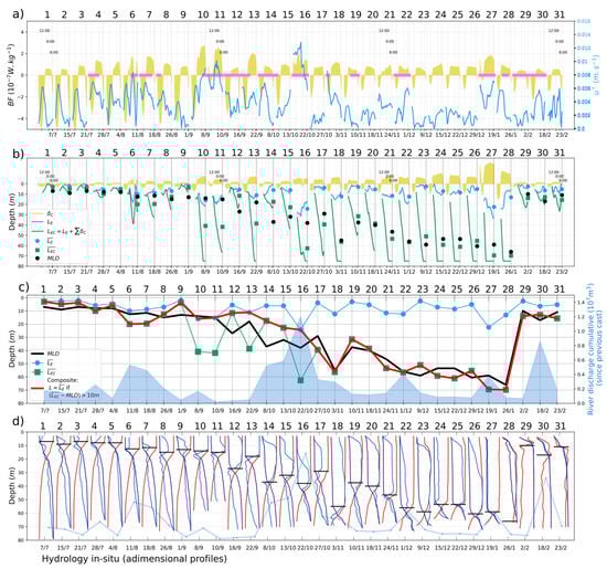 In general, negative buoyancy fluxes strengthen the stratification of the water column while positive buoyancy fluxes weaken the stratification and may lead to surface convection and a deepening of the . During summer and till mid-September, the daily averaged was always negative apart from three short episodes of positively buoyant days (Figure 3). In contrast, after mid-September, remained positive (or close to zero). Consequently, from the beginning of the observed period, the cumulative buoyancy flux decreased and reached a minimum level around mid-September (not shown) and then constantly increased from mid-October to reach a maximum at the end of the record. Buoyancy fluxes and the wind stress contribute both to mix the surface layer and deepening the . A negative flux counteracts the wind stress by stabilizing the water column, while a positive flux will add its effect to the wind mixing by destabilizing the layers. The wind stress (Figure 3a) over the summer period is weak and shows few intermittent events before mid-September (). In September, relatively strong wind events started ( close to ), followed by three events during October ( close to ). The three most energetic storms () occurred around the 20th of November, in January, and in February. The precipitation rates show intermittent events with values close to or larger than , with a maximum of about in early October, followed by intermittent rainy events during the rest of the period (Figure 3b). This time series is highly coherent with the river discharge (in blue). Wave heights are generally well correlated with the wind stress and reproduce the quiet and intensified periods (Figure 3c). Strong events show values of (e.g., mid-October) with peaks between and (e.g., mid-November, or January and February). The associated Langmuir number (pink line) indicates critical periods with values of , a regime for which Langmuir cells should contribute to the mechanical mixing at the same time as the wind. Interestingly, we see a repeating regime from July to September, with values , that is probably due to the daily cycle of the summer breeze [].
