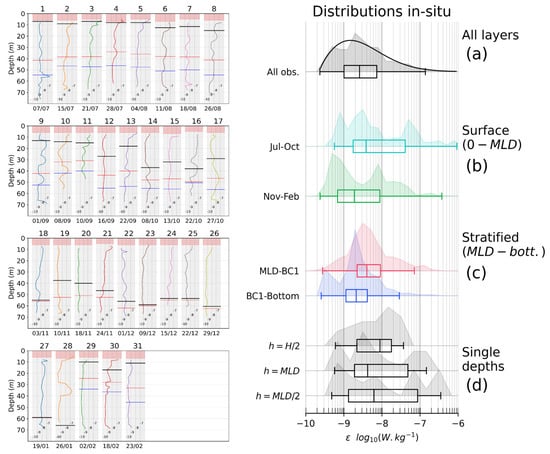 We show in Figure 5d the boxplots obtained at single locations () that are different from the more complete distributions. We want to see if general properties from the layer approach (e.g., vertical bins) can be reproduced by considering only single depths. The distribution of the layer describes the middle of the water column and contains ε occurrences characterizing both surface and stratified layers. Distributions at are comparable and closely reproduce the main peaks seen in the subsurface distributions in Figure 5b. These single depths catch the variability observed in the layers.