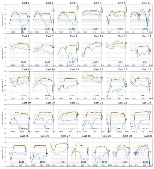 When several consecutive casts were performed, they were averaged to produce the daily representative vertical profile (Table 1). The monthly average is the mean of the parameter values for each month of the year. Linear regressions and statistics were performed using the “linregress” function from the Python library scipy.stats [], peaks were identified using the “find_peaks” function, probability distributions functions (PDF) and boxplots were calculated using the “hist” and “boxplot” functions (minimum, first quartile, median, third quartile, maximum), and the Burr XII distribution [] fit with its parameters were obtained using the “burr12” function. The fitting of probability distributions to data was performed with the Python package (https://fitter.readthedocs.io/en/latest/, accessed on 6 July 2022).