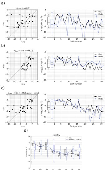 Seasonal cycle. We fruitfully exploit the sequence of the weekly snapshots from our observations to establish a seasonal cycle for ε based on the monthly time scale. From the summer 2015 to the winter 2016, we characterize a half-seasonal cycle (Figure 7d). In July, the model underestimated the observations, whose higher median value indicates that observations included more energetic processes not reproduced by the model. August and September indicate ranges of variability comparable to the model. A wide variability was obtained in October, while the observations were clearly more limited, maybe due to the conditions at sea that prevented sampling in bad weather conditions. Variability in November seems comparable. More intense events are captured by the observations in December. January and February indicate wide ranges that were partially covered by the observations.