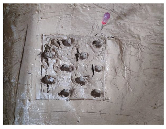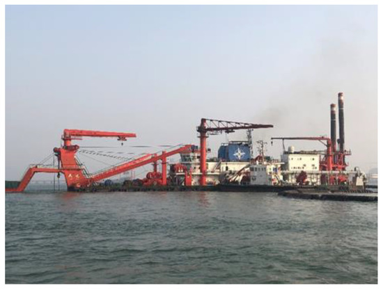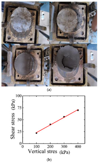 The clay used in this model test is prepared from the soil excavated from a depth of 1500 m in the South China Sea. Figure 1 is a photo taken by the author on the spot. Since there would be some impurities in the collected soil, the clay should be dried and sieved to obtain the pure clay power that can be used to prepare the test soil. The soil is fully hydrated and mixed with the aim of obtaining a homogeneous clay. Then, the soil is fully stirred, consolidated, and settled for 3 months. The purpose of consolidation settlement for 3 months is to make the soil reach the test standard. After the soil was fully saturated and consolidated, the surface was scraped to guarantee the planeness. In addition, the soil surface was covered with plastic wrap during production. The basic physical index parameters of clay are tested before the model test. This test uses the ring knife method to measure the saturated density of the clay. The specifications of the ring knife are 61.8 × 20 mm. The density of the clay is the average of three measurements. The value is 18 kN/m3. The shear properties of clay are measured by the direct shear test, which is a slow shear test. An appropriate amount of the configured soil sample is taken and placed in the shear box. The vertical stress is applied to the soil during the measurement, and the values are 100 kPa, 200 kPa, 300 kPa, and 400 kPa. The consolidation of the soil was completed by the application of vertical pressure. The horizontal shear stress was then applied to shear the soil slowly until the soil was completely sheared. The soil after measurement is shown in Figure 2. Therefore, the cohesive of the clay is 9.89 kPa. The average bulk density and undrained shear strength of clay soil [25] in all the tests were found to be 18 kN/m3 and 10 kPa, respectively.