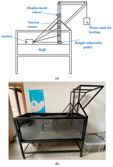 The specific experimental steps are as follows. (1) Gravity anchors are slowly placed in the center of the soil. The gravity anchor is positioned 1 m from the loading end. Additionally, the gravity anchor is positioned in the middle of the test box in the width direction. It is not simply placed on the soil surface. The upper part of the gravity anchor needs to be fitted with counterweight blocks. The aim is to sink the gravity anchor to the preset position. Prior to the start of the model test, the gravity anchor was marked with a marker at the height of 10 cm. When the gravity anchor has settled exactly to the preset depth, the counterweight is removed, and the rest of the operation begins. The tension sensor is connected to the loop on the front end of the gravity anchor. Next, the displacement sensor is installed, and the readings are zeroed. The gravity anchor was left for 10 min to allow the excess pore water pressure of the soil to dissipate. (2) Start recording. Use the water pump to add water to the water tank at a constant speed to load the gravity anchor. (3) When the anchor damages the soil, stop the test. The parallel experiment was repeated 3 times. The tensile force–displacement curve was plotted by taking the average of three parallel tests.