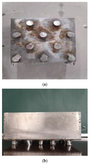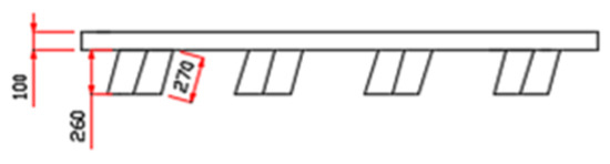Model tests were conducted in a test tank with a length of 1.75 m, a width of 0.6 m, and a height of 1.2 m, as shown in Figure 4. The height of the soil in the box during the test is 0.3 m. Other soil was laid 0.2 m at the bottom. The total height of the soil is 0.5 m. The height of the soil is 6 times the height of the gravity anchor. The boundary effect can be ignored. The soil is evenly and flatly filled in the test tank. In addition to the test tank, the device is mainly made up of an anchor model (the front, back, and top center are equipped with buckles that can connect to the steel strand), a height-adjustable pulley device, tension, and displacement sensors, and a travel switch (the switch is disconnected and stops loading after the anchor body moves in the model test). The height-adjustable pulley device is used to change the loading angle of the gravity anchor. The model of the tension sensor is TJL-1S, the range is 0~30 kg, and the overall accuracy is 0.02. The model of the displacement sensor is KS20-1000-01-C, the range is 0~1000 mm, and the accuracy is ±0.53%. The shape of the gravity anchor used in the tests is shown in Figure 5 and Figure 6. In this test, the actual gravity anchor of the project is reduced according to the ratio of 1:15. The size of the gravity anchor model in the model test is 200 mm × 200 mm × 87 mm, and the mass is 8.25 kg by using similar criterion. The anchor in the model test was made in advance. The drawing of the anchor in the actual project is shown below. The anchor is hollow and brought to a predetermined weight by adding counterweight blocks in four boxes. The oblique columns at the bottom of the anchor are the shear keys of the gravity anchor. Its function is to increase the contact area with the soil and to change the way the soil fails. These two effects increase the bearing capacity of the gravity anchor. Their exact dimensions are shown below. The height of the shear key is 260 mm, and the length is 270 mm. Its diameter is 300 mm.