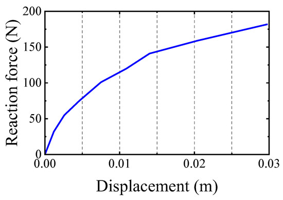 The graph of soil deformation is shown in Figure 7. It can be observed the soil has been destroyed. The load–displacement curve can be obtained by using software to synthesize and process the data collected by the sensor. The load–displacement curve of the anchor under horizontal loads is shown in Figure 8. The load carrying capacity of a gravity anchor is the maximum force that can be provided by the gravity anchor while the anchor remains stable and does not break the soil. When the gravity anchor moves to the distance of 0.01 m, the soil has been damaged, at which point the corresponding force is the gravity anchor bearing capacity.