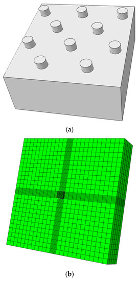 To analyze horizontal bearing mechanism of the gravity anchor, the finite element method is used to analyze the gravity anchor. The model was established based on the ABAQUS software, according to the specific dimensions of the model anchor, the size of the soil domain in the model test tank, and the boundary conditions. The length and width of the gravity anchor are both 3 m, the height is 1.3 m, the weight is 80 tons, and the floating density in seawater is 5812.6 kg/m3. The material of the gravity anchor is steel. The elastic modulus is 210 GPa, and the Poisson’s ratio is 0.3. The 3D finite element model of gravity anchor is shown in Figure 9a. The gravity anchor has 10 column bases. The height of the shear key is 260 mm and the length is 270 mm. Its diameter is 300 mm. Shear keys are evenly distributed at the bottom of the gravity anchor. The calculation range of the soil body is determined according to the outer dimensions of the anchor body. To eliminate the influence of the boundary, the depth and width of the soil are both about 5 times the corresponding height and width of the anchor. Therefore, the size of the soil model is 50 × 50 × 10 m. The 3D finite element model of soil is shown in Figure 9b.