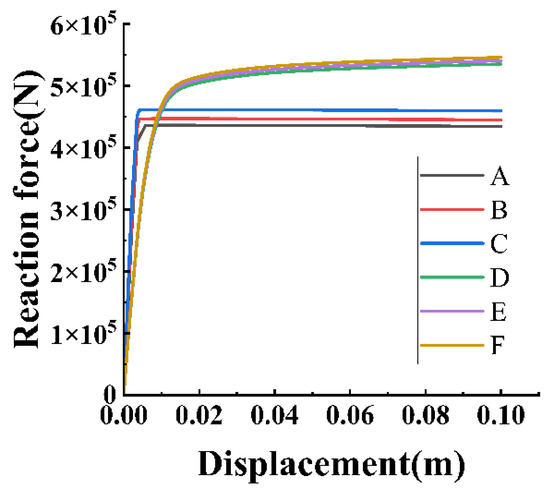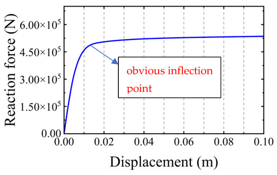 Apply loads to the model and run the software. The curves of horizontal bearing capacity and horizontal displacement are extracted to draw the image shown in Figure 11. It can be found that the curve has a more obvious inflection point. The ultimate bearing capacity of the gravity anchor is generated here. The soil is destroyed at this point. The corresponding ordinate is the horizontal bearing capacity of the gravity anchor. The result of numerical simulation is 455.7 kN, with an error of 8% after comparison with the model test. The predictions are generally in agreement with the test results, which indicate the plastic strain accumulation characteristics of the soft clay surrounding the anchor can be captured by the finite element method. So, the simulation results are considered correct and can be used for comparative analysis.