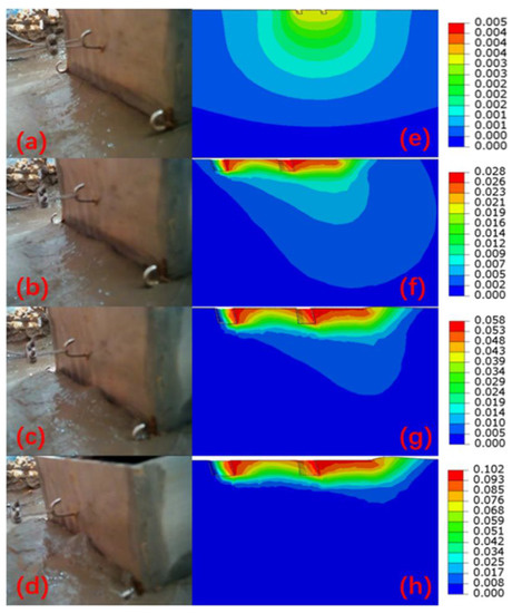 Soil deformation diagram of model test and numerical simulation: (a,e) are soil deformation diagrams when the gravity anchor moves 0 mm, (b,f) are soil deformation diagrams when the gravity anchor moves 25 mm, (c,g) are soil deformation diagrams when the gravity anchor moves 50 mm, and (d,h) are soil deformation diagrams when the gravity anchor moves 75 mm.